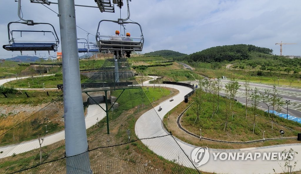 | ▲ 부산 오시리아 테마파크 루지 개장 (부산=연합뉴스) 조정호 기자 = 8일 부산 기장군 오시리아관광단지 테마파크 내 스카이라인 루지(Luge)에서 나들이객이 스카이라이드를 타고 이동하고 있다. 스카이라인 루지는 2개 스카이라이드(길이 311.7m, 314m, 체어리프트 2기)와 4개 루지 트랙(길이 2천440m), 450대 무동력 루지 카트로 구성된다. 2021.7.8 ccho@yna.co.kr |