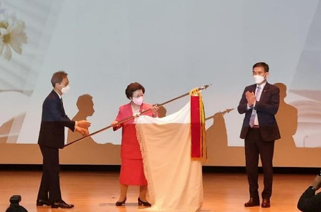 | ▲ 전통한지 유네스코 세계유산 등재 수치기 전달 모습 사진 왼쪽 김승수 전주시장이 이배용 단장에 수치기를 전달하고 있다. 이 단장은 4번째 학술포럼을 주최하는 김오현 서울 종로구 문화관광국장에게 다시 이 깃발을 전달했다.[한지살리기재단 제공] |