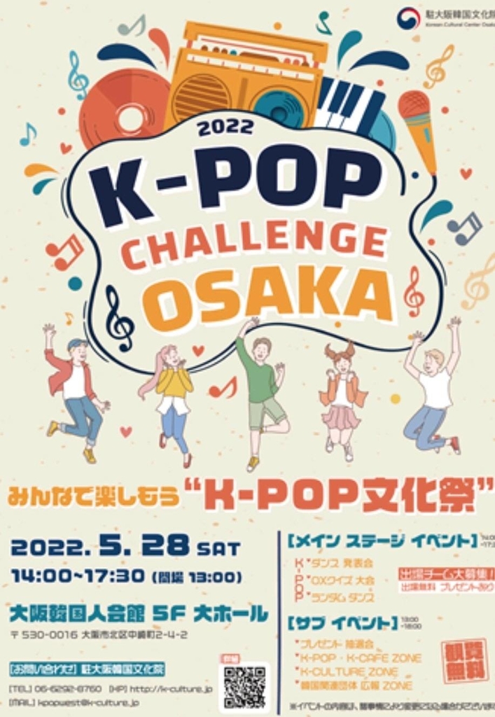 (서울=연합뉴스) 강성철 기자 = 주오사카한국문화원은 오는 28일 일본 오사카시 한국인회관 대강당에서 시민참여형 문화제인 '2022 K-팝 챌린지'를 개최한다고 11일 밝혔다.