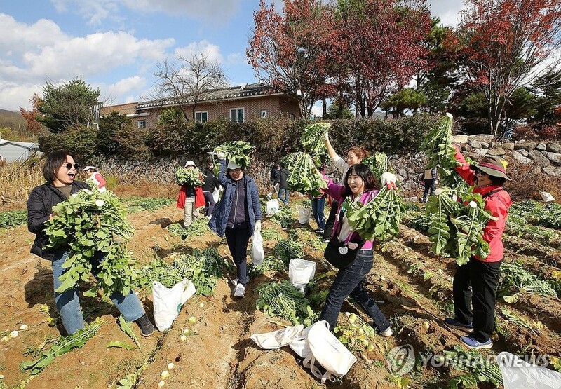| ▲ '2023 청춘양구 펀치볼 시래기 사과축제' (양구=연합뉴스) 29일 강원 양구군 해안면 일원에서 열린 '2023 청춘양구 펀치볼 시래기 사과축제'에서 관광객들이 시래기 무청 자르기 체험을 하고 있다. 2023.10.29 [양구군 제공. 재판매 및 DB 금지] yangdoo@yna.co.kr |