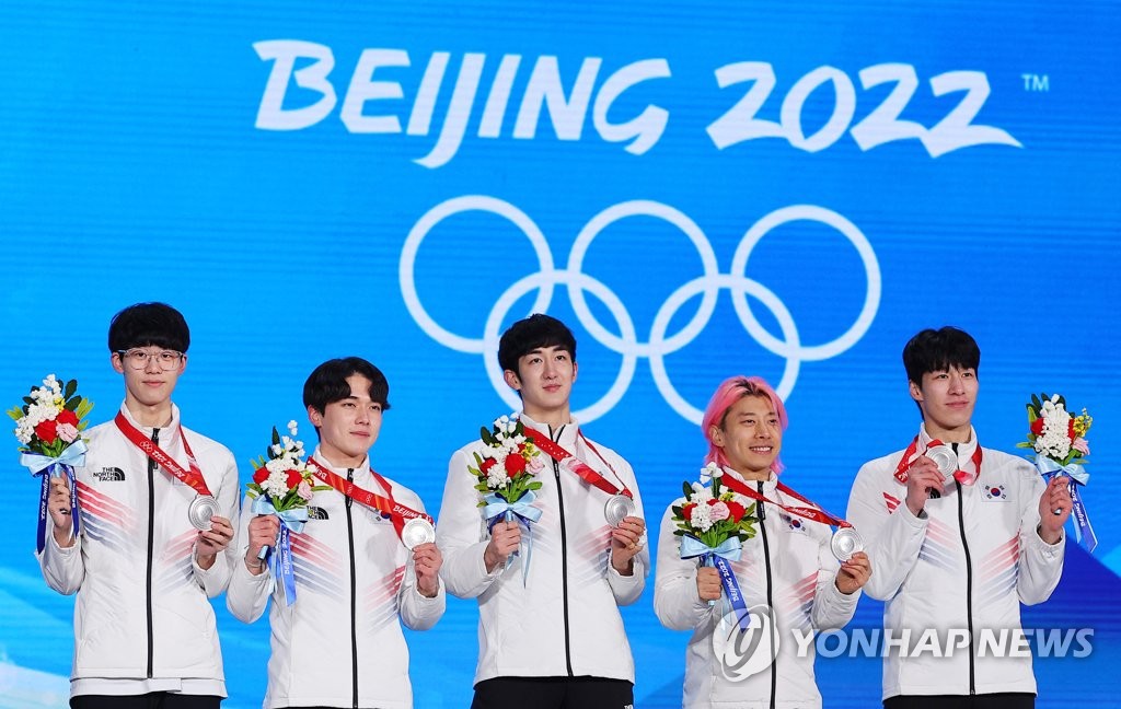 | ▲  Members of the South Korean men's short track speed skating relay team pose with the silver medals during the medal ceremony at the Beijing Winter Olympics at Beijing Medal Plaza in Beijing on Feb. 17, 2022. (Yonhap) |