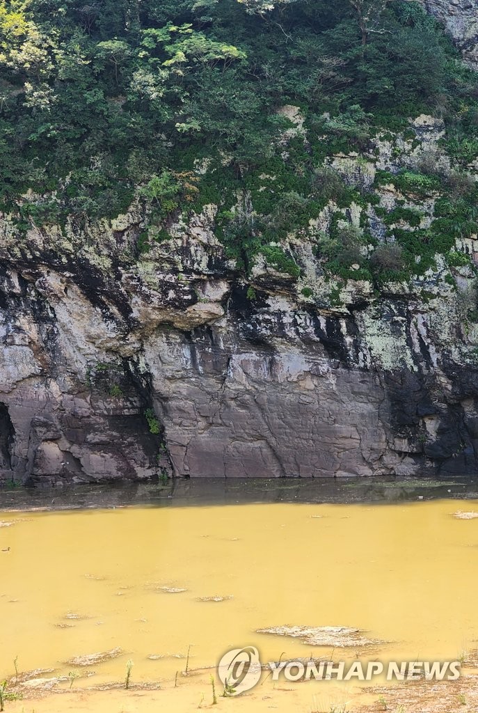 | ▲ 물에 잠긴 반구대 암각화 (울산=연합뉴스) 장지현 기자 = 제6호 태풍 카눈이 지나간 지 하루가 지난 11일 오전 울산 울주군 언양읍 반구대 암각화가 절반가량 물에 잠겨 있다. 2023.8.11 jjang23@yna.co.kr |