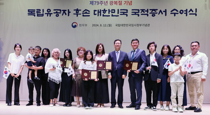 Justice Minister Park Sung-jae (6th from R) poses with overseas descendants of late Korean independence fighters from the Japanese colonial era (1910-45) after conferring certificates of Korean nationality upon them in Seoul on Aug. 12, 2024, three days ahead of Liberation Day. (Yonhap)