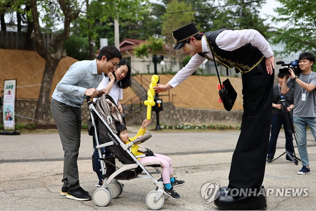 | ▲ ‘어린이정원에 온 걸 환영해’ (서울=연합뉴스) 윤동진 기자 = 4일 오후 어린이날을 하루 앞두고 개방한 용산어린이정원에서 한 어린이가 피에로에게 선물을 받고 있다. 2023.5.4 mon@yna.co.kr |