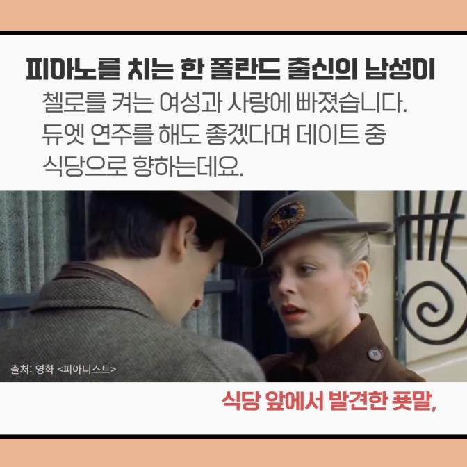영화 '피아니스트'에 나오는 장면입니다. 피아노를 치는 한 폴란드 출신의 남성이 첼로를 켜는 여성과 사랑에 빠졌습니다. 듀엣 연주를 해도 좋겠다며 데이트 중 식당으로 향하는데요.