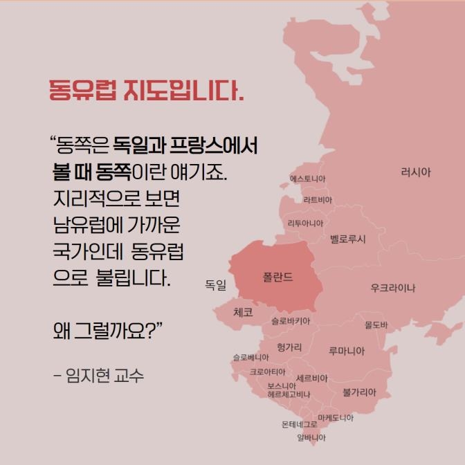 "동쪽은 독일과 프랑스에서 볼 때 동쪽이란 얘기죠. 지리적으로 보면 남유럽에 가까운 국가인데 동유럽으로 불립니다. 왜 그럴까요?" - 임지현 교수