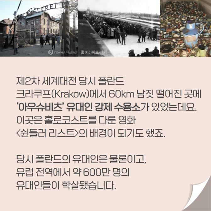 제2차 세계대전 당시 폴란드 크라쿠프(Krakow)에서 60km 남짓 떨어진 곳에 '아우슈비츠' 유대인 강제 수용소가 있었는데요. 이곳은 홀로코스트를 다룬 영화 '쉰들러 리스트'의 배경이 되기도 했죠.