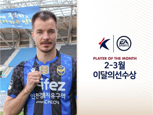 SEOUL, April 7 (Yonhap) -- Incheon United striker Stefan Mugosa was named the first recipient of the Player of the Month award in the ongoing K League 1 season Thursday.