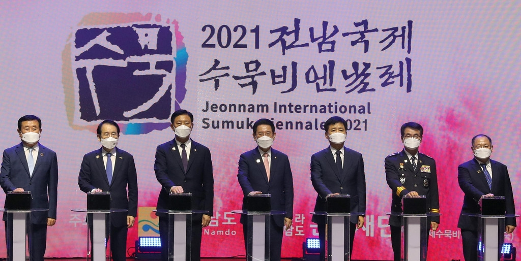 (목포=연합뉴스) 여운창 기자 = 전통 수묵을 대중화하고, 그 가치를 재조명해 전남의 미래문화 콘텐츠로 육성하기 위한 2021 전남국제수묵비엔날레가 1일 목포 문화예술회관에서 개막식을 시작으로 2개월간의 '수묵 대장정'에 들어갔다.