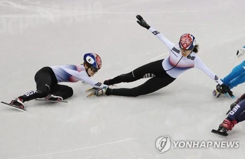 | ▲ In this file photo from Feb. 22, 2018, Choi Min-jeong of South Korea (L) falls after a collision with her teammate, Shim Suk-hee, during the women's 1,000m short track speed skating final at the PyeongChang Winter Olympics at Gangneung Ice Arena in Gangneung, 230 kilometers east of Seoul. (Yonhap) |