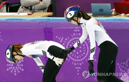 | ▲ In this file photo from Feb. 22, 2018, Shim Suk-hee of South Korea (R) consoles her teammate, Choi Min-jeong, after their collision during the women's 1,000m short track speed skating final at the PyeongChang Winter Olympics at Gangneung Ice Arena in Gangneung, 230 kilometers east of Seoul. (Yonhap) |