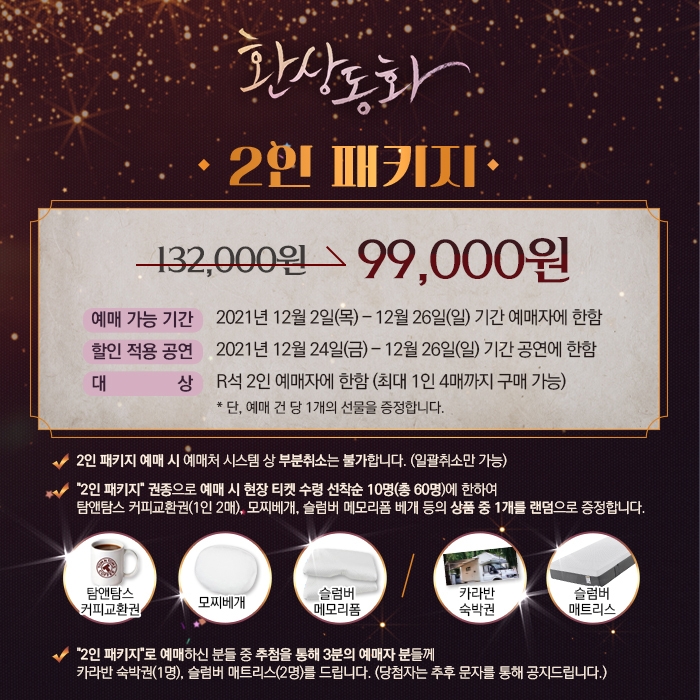 티켓 2인권 구매 시 특가 할인이 적용되며, 선착순으로 커피교환권 등을 증정한다. 관객 추첨을 통해에서 선물을 제공한다.