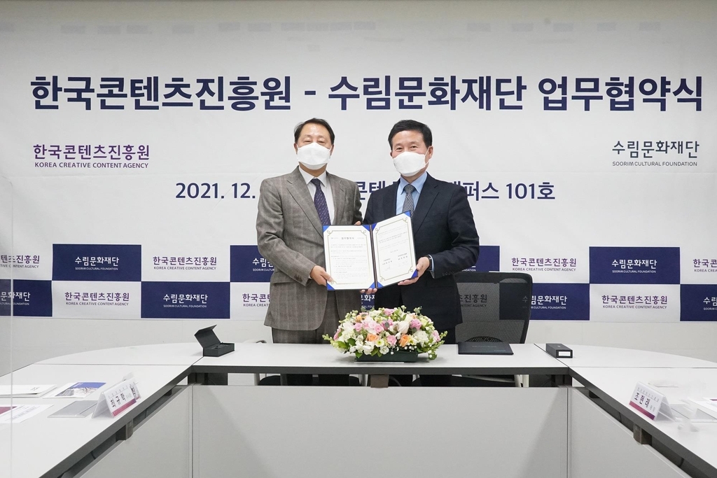 (서울=연합뉴스) 이은정 기자 = 수림문화재단과 한국콘텐츠진흥원은 지난 22일 서울 동대문구 콘텐츠인재캠퍼스에서 업무협약을 체결했다고 23일 밝혔다.
