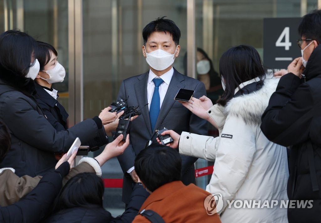 | ▲ Yoon Joo-tak, a lawyer representing South Korean short track speed skater Shim Suk-hee, speaks to reporters outside the Seoul Eastern District Court building in Seoul on Jan. 12, 2022, after attending a hearing on Shim's application for a court injunction against a two-month ban on the skater handed down by the Korea Skating Union. (Yonhap) |