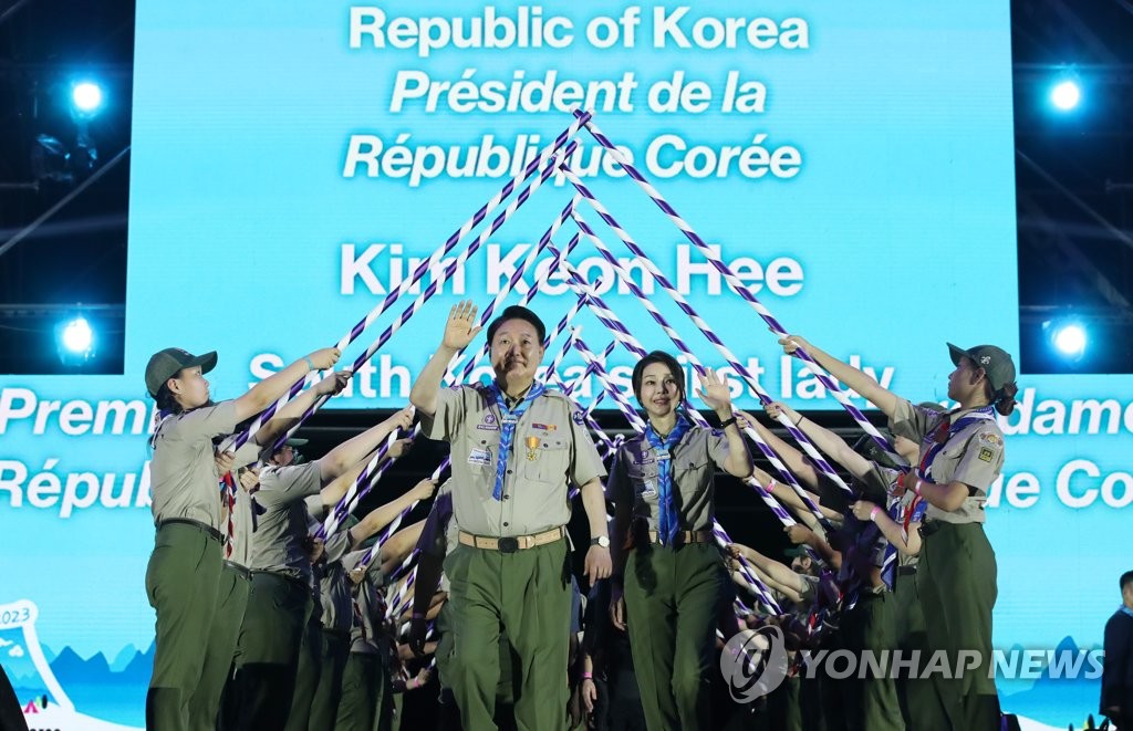 | ▲ 세계스카우트잼버리 개영식 입장하는 윤석열 대통령 부부 (부안=연합뉴스) 임헌정 기자 = 윤석열 대통령과 김건희 여사가 2일 오후 전북 부안 새만금 부지에서 열린 '2023 새만금 제25회 세계스카우트잼버리' 개영식에서 스카우트 최고의 예우를 표하는 장문례를 받으며 입장하고 있다. 2023.8.2 [대통령실통신사진기자단] kane@yna.co.kr |