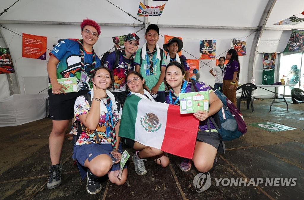 | ▲ 환하게 웃는 멕시코 스카우트 대원들 (부안=연합뉴스) 정경재 기자 = 2023 새만금 세계스카우트잼버리 개영일인 2일 전북 부안군 하서면 야영장 인근에 마련된 '반기문 지속 가능한 발전 목표(SDGs) 마을'에서 스카우트 대원들이 취재진을 보고 활짝 웃고 있다. 2023.8.2 jaya@yna.co.kr |