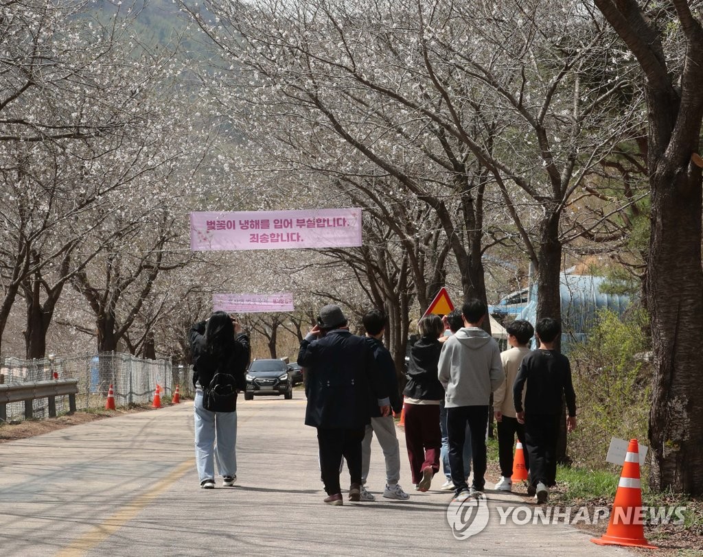 | ▲ 냉해로 앙상해진 벚꽃길 (춘천=연합뉴스) 강태현 기자 = '제1회 북산면 벚꽃축제' 개막식이 열린 10일 강원 춘천시 북산면 부귀리 일대에서 시민들이 벚꽃을 감상하고 있다. 예년보다 일찍 핀 벚꽃에 춘천시가 축제와 개막식 일정을 앞당겨 진행했으나 냉해로 인해 꽃잎이 빨리 떨어지자 이에 사과하는 현수막이 달려 있다. 2023.4.10 taetae@yna.co.kr |