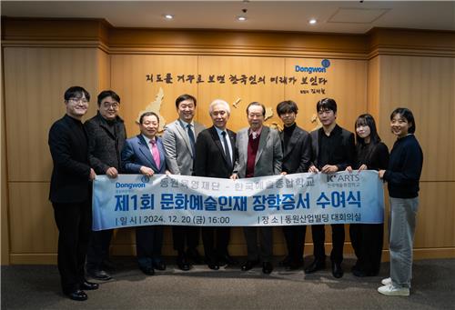 (서울=연합뉴스) 임순현 기자 = ▲ 한예종-동원육영재단, 장학금 5천만원 수여 = 한국예술종합학교와 동원육영재단은 20일 서울 서초구 동원그룹 본사에서 '제1회 문화예술인재 장학증서 수여식'을 열고 학생 5명에게 총 5천만원의 장학금을 수여했다고 24일 밝혔다.