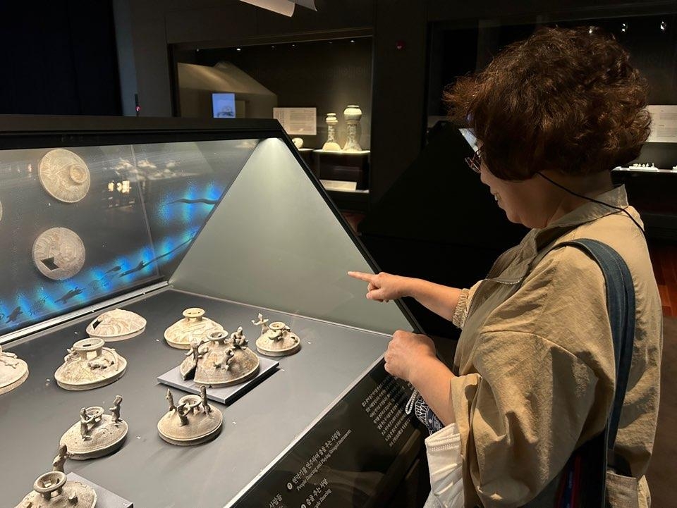 | ▲ (서울=연합뉴스) 김예나 기자 = 25일 서울 국립중앙박물관에서 공개된 '영원한 여정, 특별한 동행' 특별전 전시장에서 나여생 씨가 토우 장식 토기를 보고 있다. 나씨는 1999년부터 박물관에서 자원봉사자로 활동하며 토기 유물의 접합, 복원에 힘을 보탰다. 2023.5.25 |
