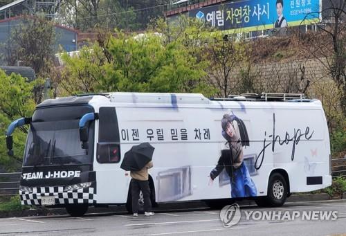 | ▲ A bus covered with a message of support for BTS member J-Hope and a photo of him, which is believed to be sent by the band's fandom, ARMY, is parked outside an Army boot camp in Wonju, 87 kilometers southeast of Seoul, on April 18, 2023. J-Hope entered the camp to begin his mandatory military service that day. (Yonhap) |