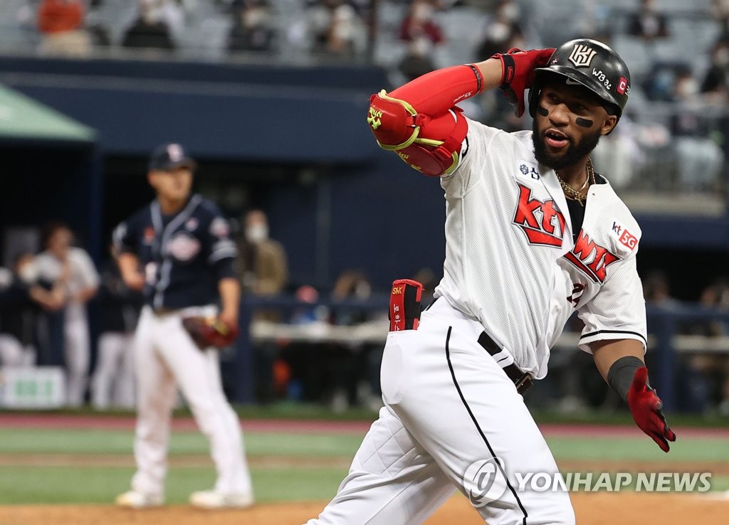 ▲ In this file photo from Nov. 10, 2020, Mel Rojas Jr. of the KT Wiz celebrates his solo home run against the Doosan Bears in the bottom of the third inning of Game 2 of the second-round series in the Korea Baseball Organization postseason at Gocheok Sky Dome in Seoul. (Yonhap)