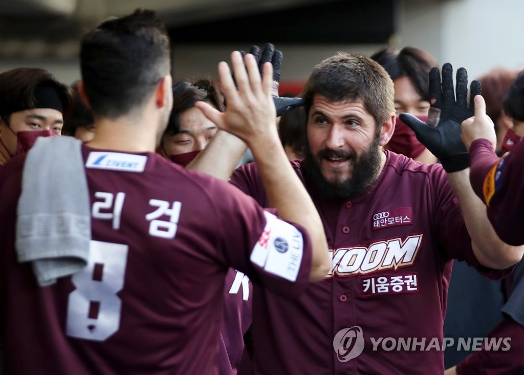 | ▲ In this file photo from May 27, 2021, David Freitas of the Kiwoom Heroes (R) is greeted by his teammates after hitting a solo home run against the Kia Tigers in the top of the second inning of a Korea Baseball Organization regular season game at Gwangju-Kia Champions Field in Gwangju, 330 kilometers south of Seoul. (Yonhap) |