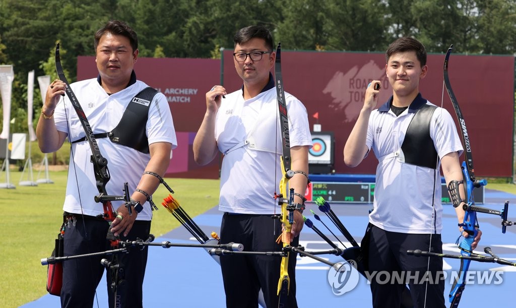 ▲ Members of the South Korean men's archery team for the Tokyo Olympics pose for photos during their media day event at the Jincheon National Training Center in Jincheon, 90 kilometers south of Seoul, on June 28, 2021. From left: Oh Jin-hyek, Kim Woo-jin and Kim Je-deok. (Yonhap)