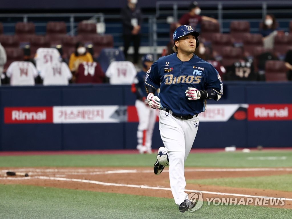 | ▲ In this file photo from May 23, 2021, Park Sok-min of the NC Dinos heads to first base after hitting a solo home run against the Kiwoom Heroes in the top of the fourth inning of a Korea Baseball Organization regular season game at Gocheok Sky Dome in Seoul. (Yonhap) |