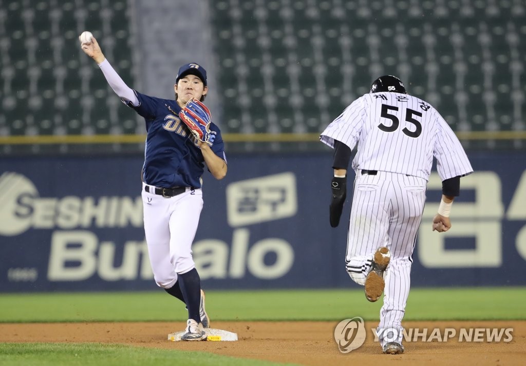 | ▲ In this file photo from June 10, 2021, NC Dinos' second baseman Park Min-woo (L) throws to first to complete a double play against the LG Twins in the bottom of the fifth inning of a Korea Baseball Organization regular season game at Jamsil Baseball Stadium in Seoul. (Yonhap) |
