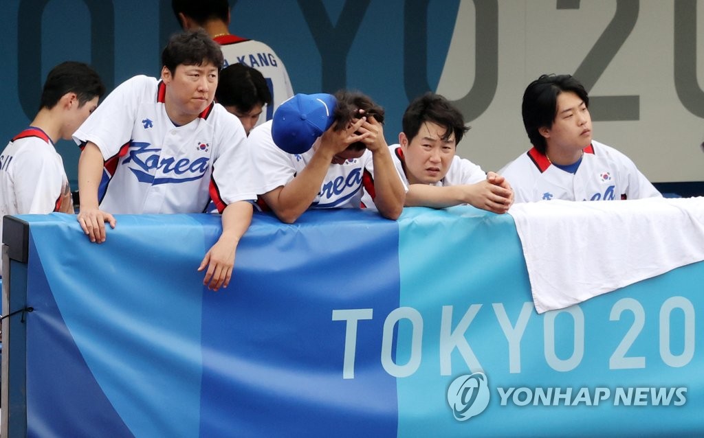 ▲ South Korean players react to their 10-6 loss to the Dominican Republic in the bronze medal game at the Tokyo Olympic baseball tournament at Yokohama Stadium in Yokohama, Japan, on Aug. 7, 2021. (Yonhap)