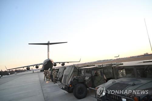 | ▲ This AFP photo shows servicemen of the Ukrainian Military Forces examining the High Mobility Multipurpose Wheeled Vehicle (HMMWV) military trucks shipped from Lithuania to Boryspil airport in Kyiv on Feb. 13, 2022. (PHOTO NOT FOR SALE) (Yonhap) |