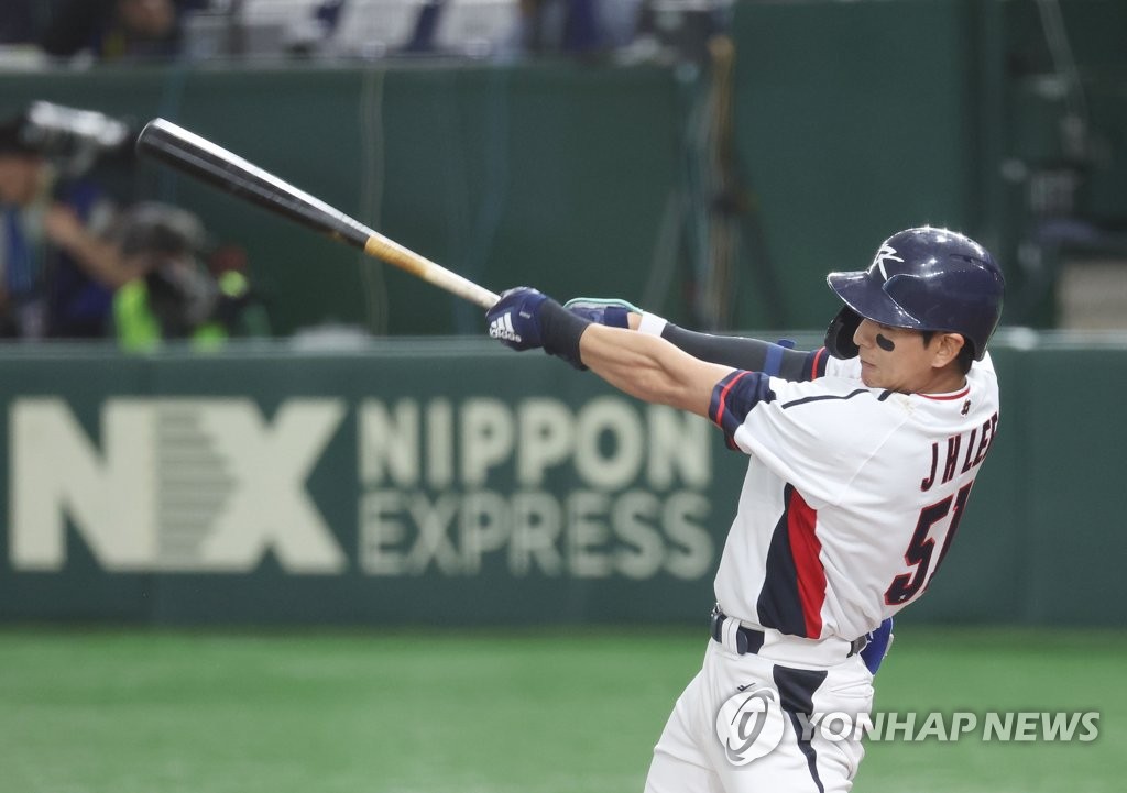| ▲ 이정후 1타점 안타 (도쿄=연합뉴스) 신준희 기자 = 12일 일본 도쿄돔에서 열린 2023 월드베이스볼클래식(WBC) B조 본선 1라운드 한국과 체코의 경기. 1회말 1사 1,3루 상황에서 한국 이정후가 1타점 안타를 치고 있다. 2023.3.12 hama@yna.co.kr |