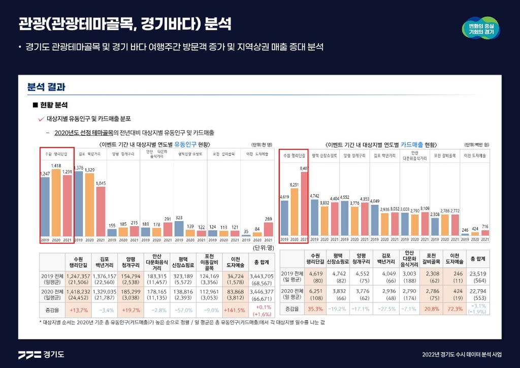 분석 자료를 보면, 2020년과 2021년 지정된 14개 관광테마골목 가운데 지정 전후 유동 인구와 카드 매출이 동시에 증가한 곳은 수원 행리단길과 이천 도자예술마을 회랑길 등 2곳이다.
