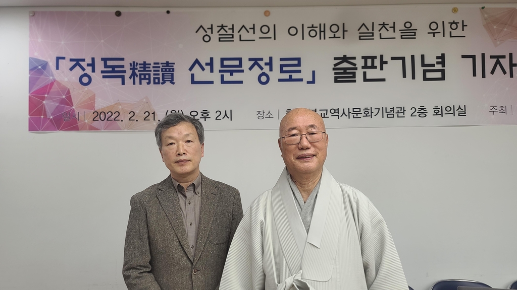 | ▲ 출판 간담회 참석한 강경구 교수와 원택스님 (서울=연합뉴스) 양정우 기자 = '정독 선문정로'를 펴낸 강경구 동의대 교수와 책 감수작업을 했던 원택스님이 21일 서울 종로구 조계종 총무원에서 열린 책 출간 기념 간담회에서 사진촬영에 응하고 있다. 2022.2.21 eddie@yna.co.kr (끝) |