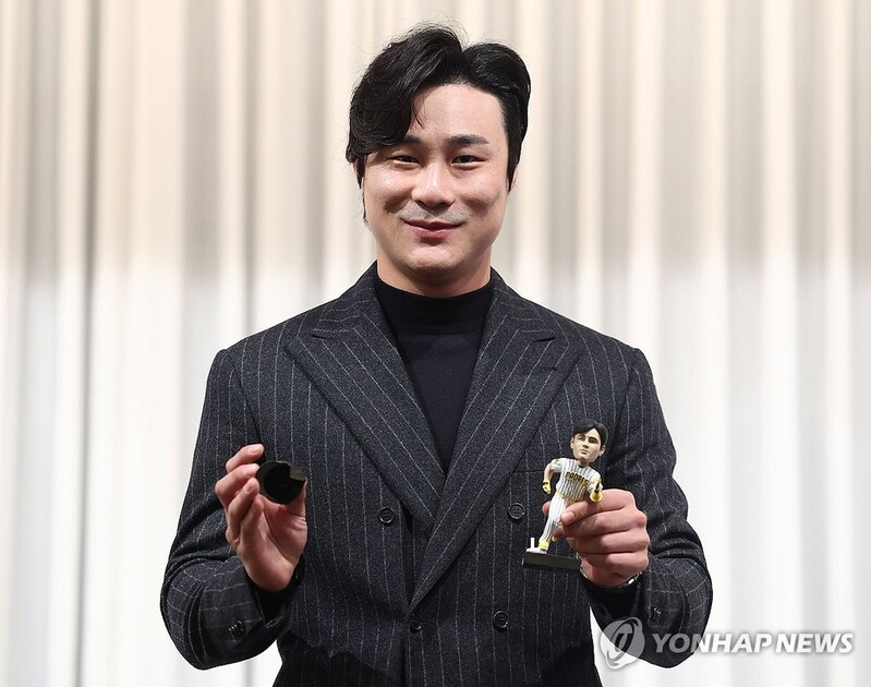 | ▲ 본인 피규어 든 김하성 (서울=연합뉴스) 류영석 기자 = 미국프로야구 메이저리그에서 골든글러브를 수상한 김하성(샌디에이고 파드리스)이 20일 오전 서울 강남구 호텔리베라에서 열린 수상 공식 기자회견에서 기념촬영을 하고 있다. 2023.11.20 ondol@yna.co.kr |