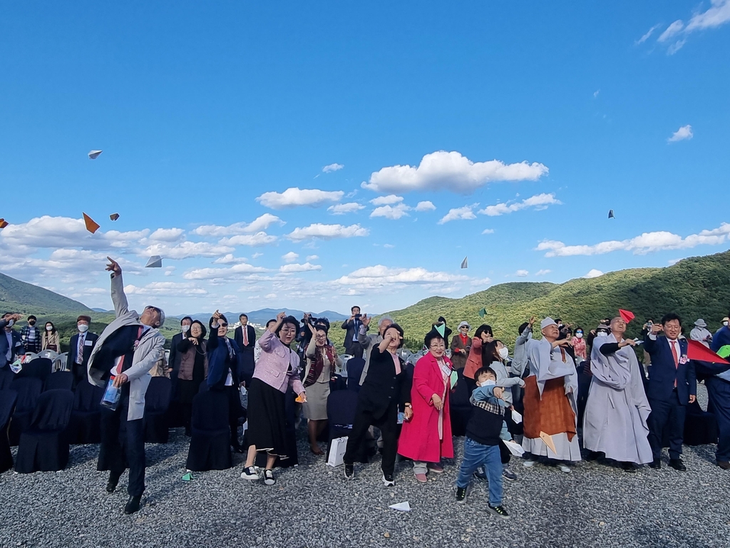| ▲ '전통 한지 유네스코 인류무형문화유산 등재' 기원 소망의 종이비행기 날리기 장면 [한지살리기재단 제공] |