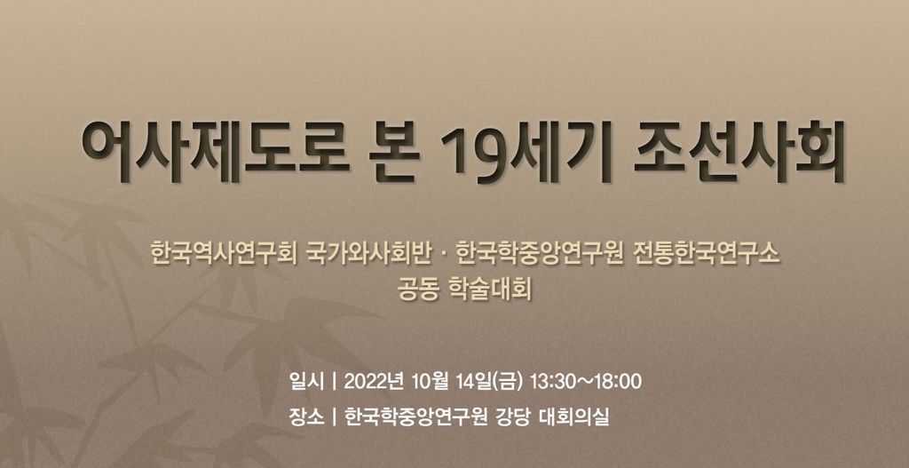 ▲ 한국역사연구회, '어사 제도로 본 19세기 조선' 학술대회 = 한국역사연구회는 한국학중앙연구원과 함께 14일 '어사 제도로 본 19세기 조선사회'를 주제로 한 학술대회를 연다.