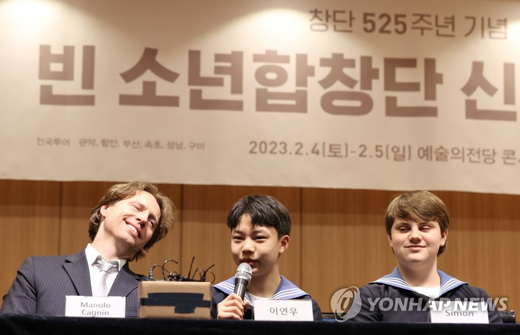 | ▲ 빈 소년합창단 '창단 525주년 기념 내한 투어' (서울=연합뉴스) 이재희 기자 = 26일 오후 서울 서초구 코스모스아트홀에서 열린 '빈 소년합창단 창단 525주년 기념 내한 투어' 기자간담회에서 마놀로 까닌 지휘자와 합창단이 시연하고 있다. 2023.1.26 scape@yna.co.kr |