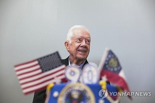 | ▲ This file photo, released by the Associated Press, shows former President Jimmy Carter standing behind his birthday cake during his 90th birthday celebration at Georgia Southwestern State University in Americus, Georgia, on Oct. 4, 2014. (Yonhap) |