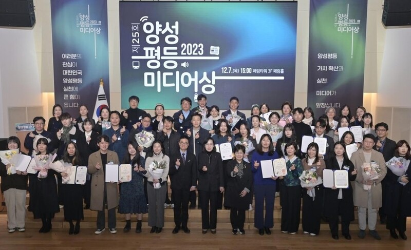| ▲ 제25회 양성평등 미디어상 수상자 모두가 함께 모여 단체 기념촬영을 하고 있다 [한국양성평등교육진흥원 제공] |