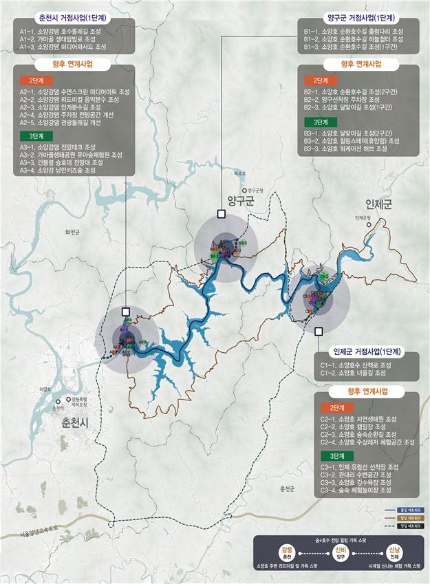 거점사업은 춘천의 호수 둘레길과 댐 미디어파사드 조성, 양구 출렁다리 및 순환호수길 조성, 인제 호수산책로와 너울길 조성 등이다.