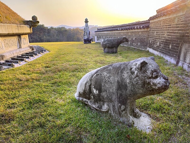 자연과 단정하게 어울리는 듯한 봉분과 주변의 석마(石馬), 문석인(文石人)과 무석인(武石人), 석양(石羊)과 석호(石虎)가 보였다.