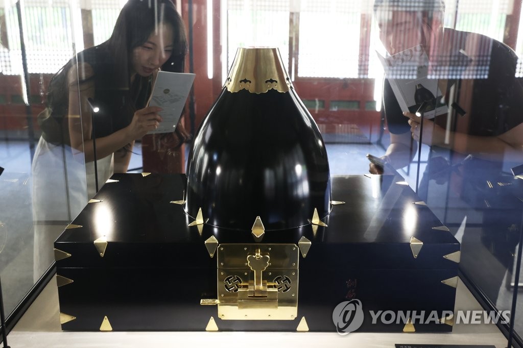 | ▲ 고종황제가 '하인리히 왕자에게 보낸 선물' (서울=연합뉴스) 강민지 기자 = 19일 서울 중구 덕수궁 덕홍전에서 한ㆍ독 수교 140주년 기념 국외소재 전통공예품 재현 사업 특별전 '1899, 하인리히 왕자에게 보낸 선물' 개막식 참석자들이 고종황제가 독일 왕자에게 선물로 보낸 갑주함을 재현한 작품을 살펴보고 있다. 2023.6.19 mjkang@yna.co.kr |