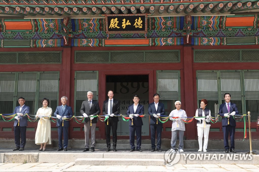 | ▲ '1899, 하인리히 왕자에게 보낸 선물' (서울=연합뉴스) 강민지 기자 = 19일 서울 중구 덕수궁 덕홍전 앞에서 한ㆍ독 수교 140주년 기념 국외소재 전통공예품 재현 사업 특별전 '1899, 하인리히 왕자에게 보낸 선물' 개막 테이프 커팅식이 열리고 있다. 2023.6.19 mjkang@yna.co.kr |