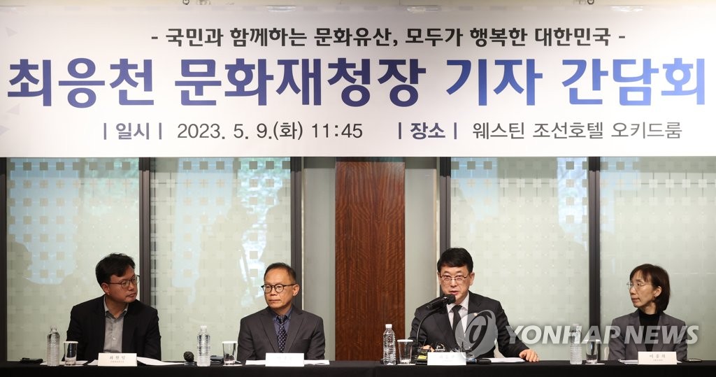| ▲ 취임 1주년 기자간담회 연 최응천 문화재청장 (서울=연합뉴스) 이재희 기자 = 최응천 문화재청장(오른쪽 두번째)이 9일 오전 서울 중구 웨스틴조선호텔에서 열린 취임 1주년 기자 간담회에서 인사말을 하고 있다. 2023.5.9 scape@yna.co.kr |