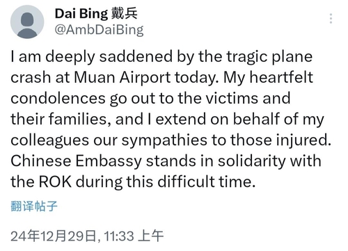SEOUL, Dec. 29 (Yonhap) -- Chinese Ambassador to South Korea Dai Bing expressed condolences on Sunday to the victims of the deadly plane crash at an airport in the southwestern county of Muan, which left at least 62 people dead, and their families.