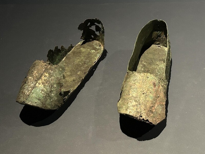 | ▲ 나주 신촌리 9호분 출토 금동 신발 (나주=연합뉴스) 김예나 기자 = 14일 국립나주박물관 상설전시실에 전남 나주 신촌리 9호 무덤 독널 을관(乙棺)에서 출토된 금동 신발이 전시돼 있다. 오른쪽은 3차원(3D) 프린터를 활용해 부분을 복원한 것이다. 2023.12.14