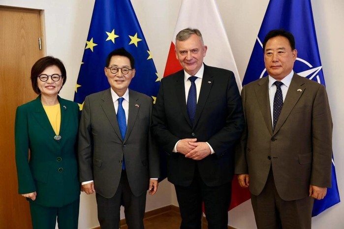 South Korean President Lee Jae Myung's special envoys -- Jin Sun-mee (L), Park Jie-won (2nd from L) and Eoh Kiy-ku (R) -- pose for a photo with Polish Deputy Defense Minister Pawel Bejda during their meeting in Warsaw on July 28, 2025, in this photo released by the South Korean foreign ministry. (PHOTO NOT FOR SALE) (Yonhap)