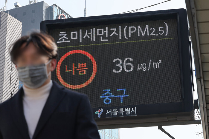 An electric signboard shows that the atmospheric level of PM2.5, harmful particles smaller than 2.5 microns in diameter, is "bad," with 36 micrograms per cubic meter, in Seoul's Jung Ward on March 11, 2025, as the government took emergency measures against air pollutants in the capital area. (Yonhap)