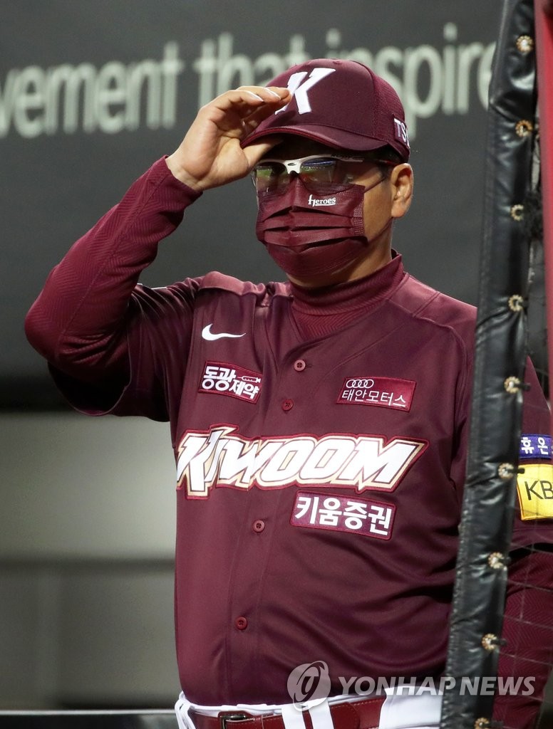 | ▲  In this file photo from Oct. 1, 2021, Kiwoom Heroes manager Hong Won-ki tips his cap toward the opposite dugout before a Korea Baseball Organization regular season game against the Kia Tigers at Gwangju-Kia Champions Field in Gwangju, some 330 kilometers south of Seoul. (Yonhap) |